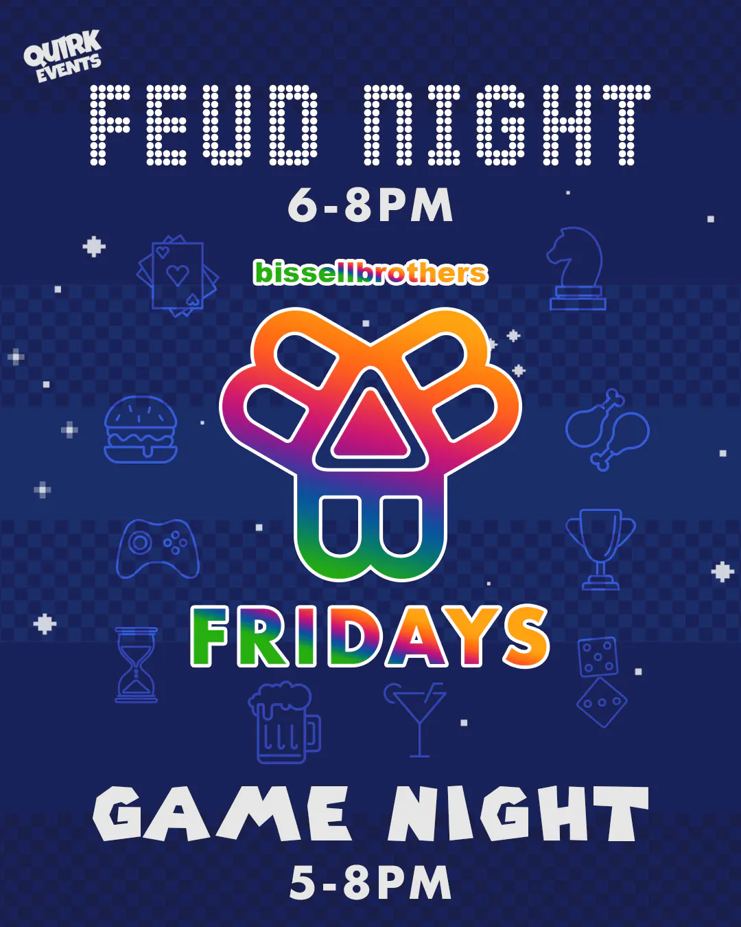 Bissell Brothers 38 Resurgam Pl, Portland, ME, United StatesGame on. Every Friday evening we host Feud Night hosted by Quirk Events, plus Mario Kart and a selection of board/card games in the taproom.